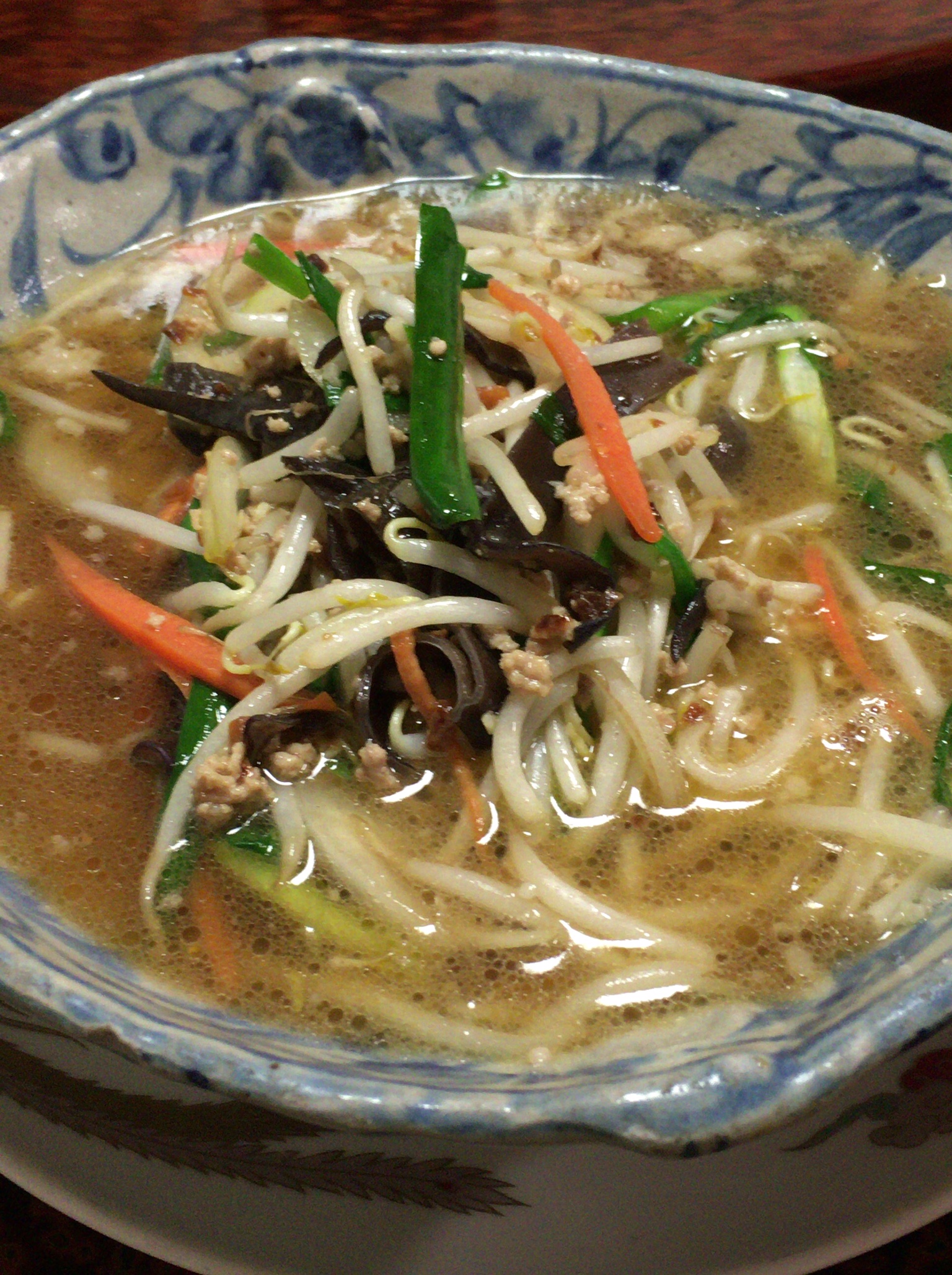 見てください、この器!ラーメンも美味しそうに見えます。実際、このニラもやし炒めラーメンは美味しいんですよね。野菜はキャベツや玉ねぎが入っているんですが、シャキシャキしていて、コンブも美味しいです。